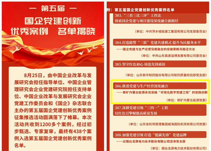 8月25日,由中国企业改革与发展研究会党建工作委员会、《国企》杂志联合主办的国企优秀党建案例评选活动落下帷幕。内蒙古能源党委报送的《推进党建与生产经营深度融合——新矿内蒙古能源系统实施“可视化数字党建工程”的实践创新》党建案例,经过专家初审、复审和终评,从1200多个申报案例中脱颖而出,被评为“第五届国企党建创新优秀案例”,成为山东能源唯一一家获此殊荣的单位。