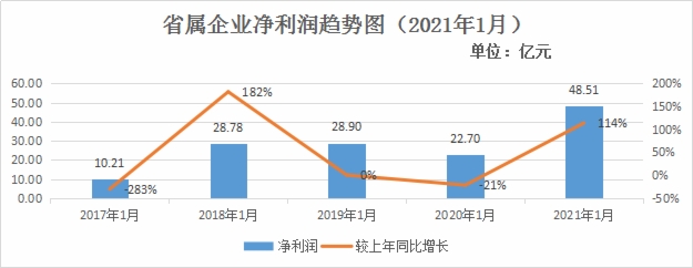 根据财务快报,2021年1月份,累计实现营业总收入1417.7亿元,同比增长40.14%;累计实现利润总额67.67亿元,同比增长113.12%;净利润48.51亿元,同比增长131.91%;归属于母公司所有者的净利润8.18亿元,同比扭亏转盈增加11.28亿元。1月末,省属企业资产总额37343.21亿元,同比增长7.43%。